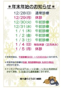 ※年末年始の診察は、別途 特別診察料金